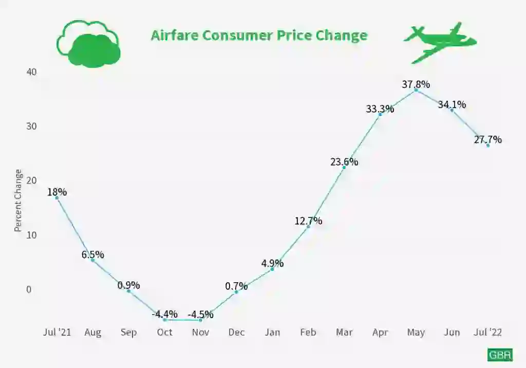 While the all-items index for the 12 months ending July decreased to 8.5% — still a high figure — the index for airline fares fell sharply in July, decreasing 7.8%. This follows the much more modest 1.8% decrease in June. It’s important to note, however, that on a year-over-year basis, airline fares are up a whopping 27.7%.