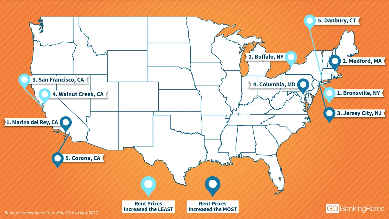 Methodology: Cities were ranked according to the year-over-year change (from May 2016 to May 2017) in dollar amounts of the median rental price for a single-bedroom residence. Data was sourced and pulled from Zillow in June 2017.