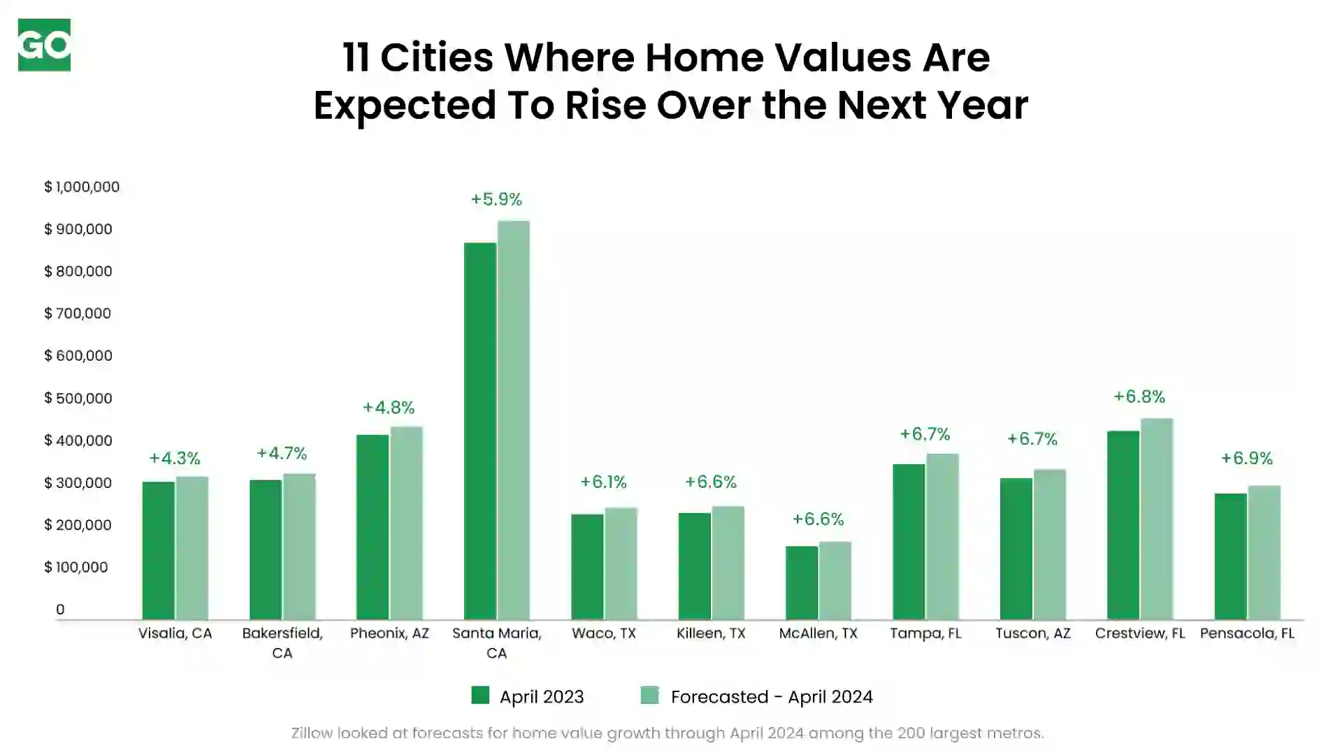 Methodology: Zillow looked at forecasts for home value growth through April 2024 among the 200 largest metros.
