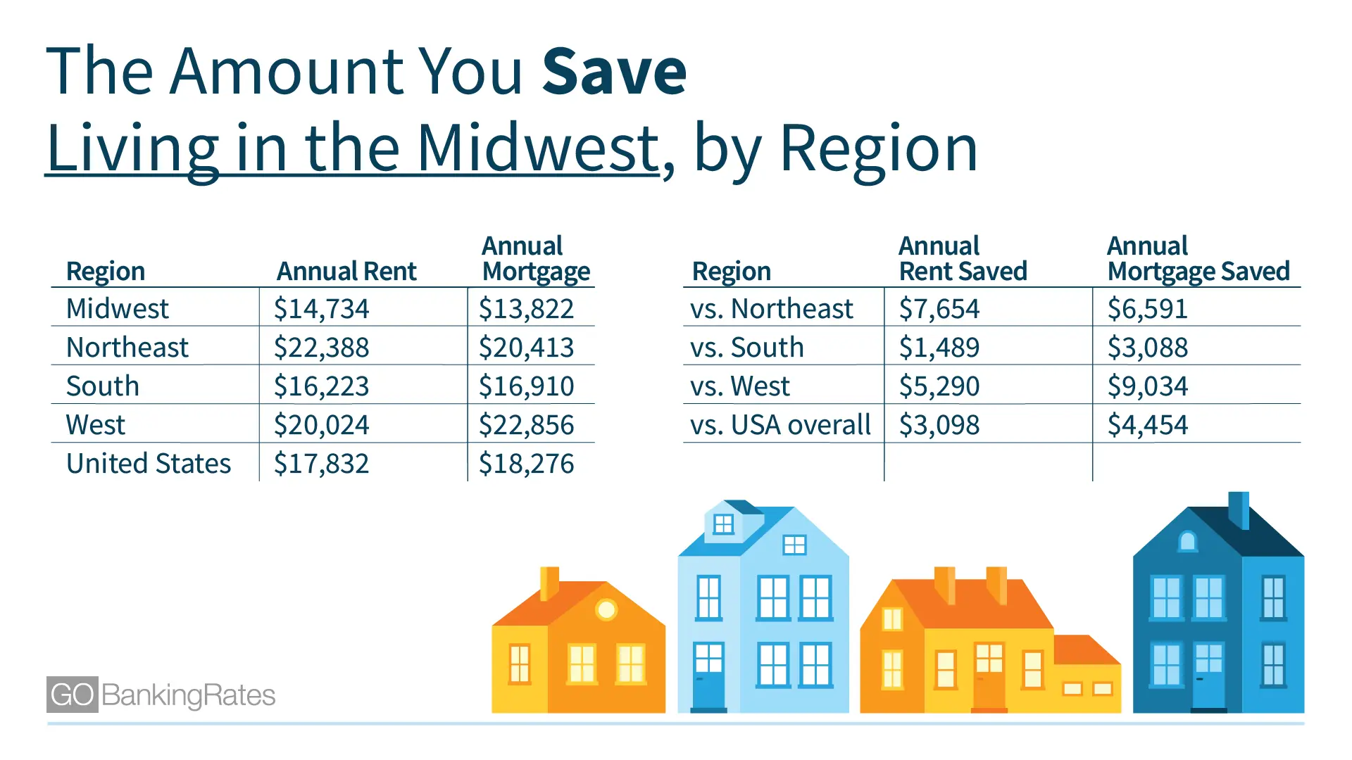 Compared to other areas in the country, the Midwest region offers significant savings in rent payments. If you choose to rent in the Midwest, you’ll pay $14,734 annually versus $22,388 annually in the Northeast — saving $7,654 each year. Renters in the Midwest also save $5,290 per year compared to renters in the West. The difference isn’t as significant when you compare to the South, but you’ll still save $1,489 in rent annually.
