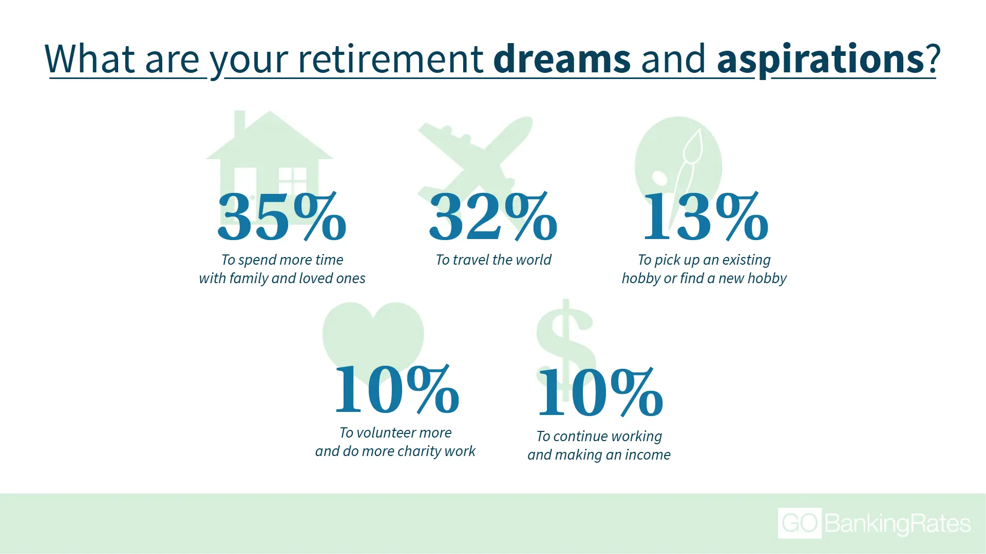 There are a variety of ways Americans want to spend their retirement, but the most common is with friends and family. The survey found that 35 percent of respondents said spending more time with loved ones is their retirement dream. And Americans are more likely to want live close to family in retirement than other places such as in the country or even the beach.