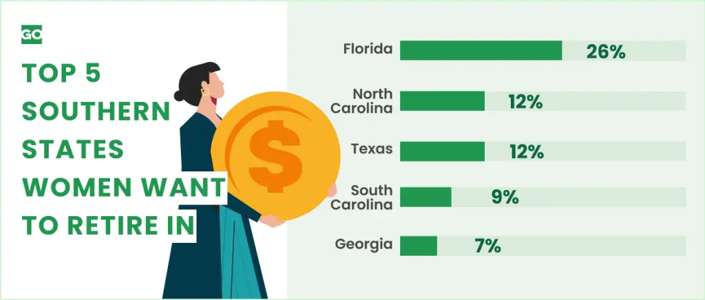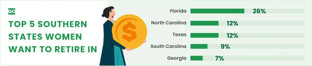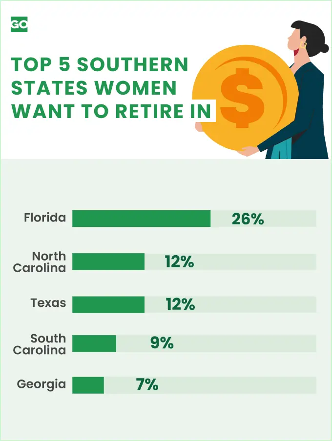 Nearly half of women (45%) would like to retire in the South, a separate GOBankingRates study found. The Southern state women most want to retire in is Florida (26%) followed by North Carolina (12%), Texas (12%), South Carolina (9%) and Georgia (7%).