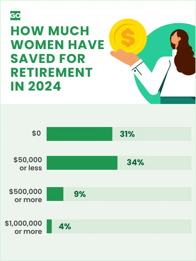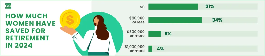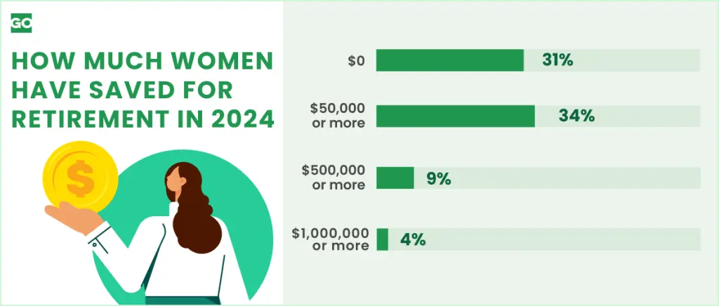 The GOBankingRates survey found that 31% of women have nothing saved for retirement and an additional 37% have less than $50,000 saved. Only 7% of women have over $750,000 saved, with 4% having over $1 million saved.