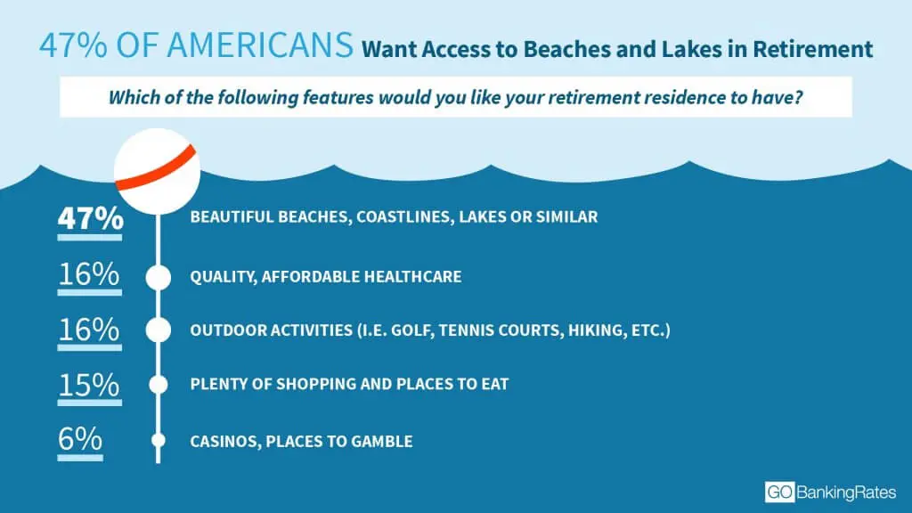 Nearly half (47 percent) of Americans say they want their retirement locale to have beautiful beaches, coastlines, lakes or other picturesque features. Quality, affordable healthcare and outdoor activities were each named by 16 percent of respondents as being desirable.