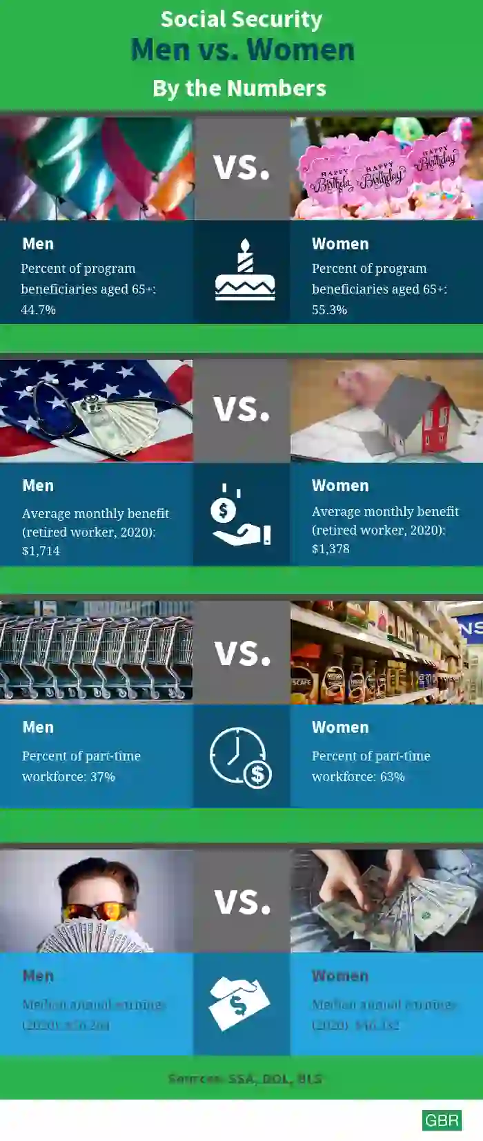 The age and income differences that play out in American society between the sexes end up having a big effect on Social Security. As men tend to earn more, they tend to earn higher monthly Social Security benefits. This trend has slowly been reversing over time, however, so it’s conceivable that in future generations, this monthly payout discrepancy will diminish or even vanish. For this to be accomplished, more women will have to participate full time in the workforce, and employers will have to pay them the same wages as they pay men.