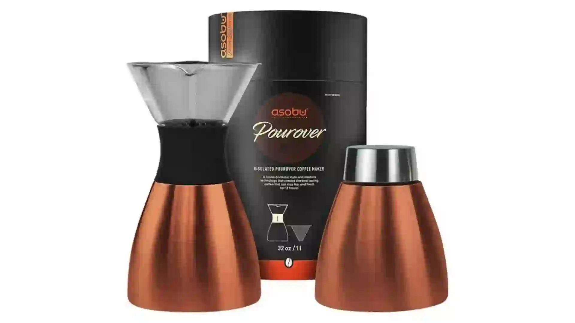 Pour-over coffee enthusiasts, or those who are interested, will appreciate the BPA-free Asobu insulated pour-over coffee maker. The 32-ounce carafe is made from heat-resistant borosilicate glass with a copper-lined, double-walled insulated build that helps keep coffee hot for up to 12 hours. Additionally, the stainless steel micro-mesh filter eliminates the need for paper filters and provides a more robust flavor profile.