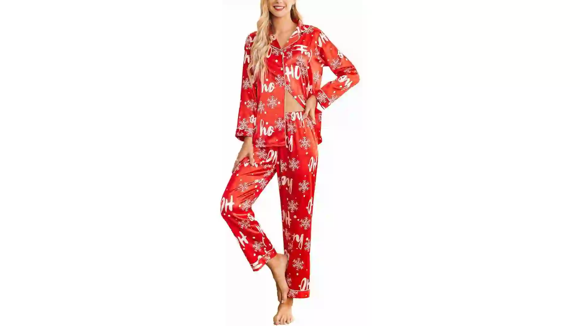 The holiday season starts when you say it starts — and you say it starts as soon as you slip into this comfortable pair of Christmas-themed satin silk pajamas. They’re patterned with Santa’s signature saying, “Ho, ho, ho,” in a variety of fonts, making them versatile enough to wear outside the house. Pair the top with leggings or jeans for a quick jaunt to the mall or to meet a friend for hot cocoa.