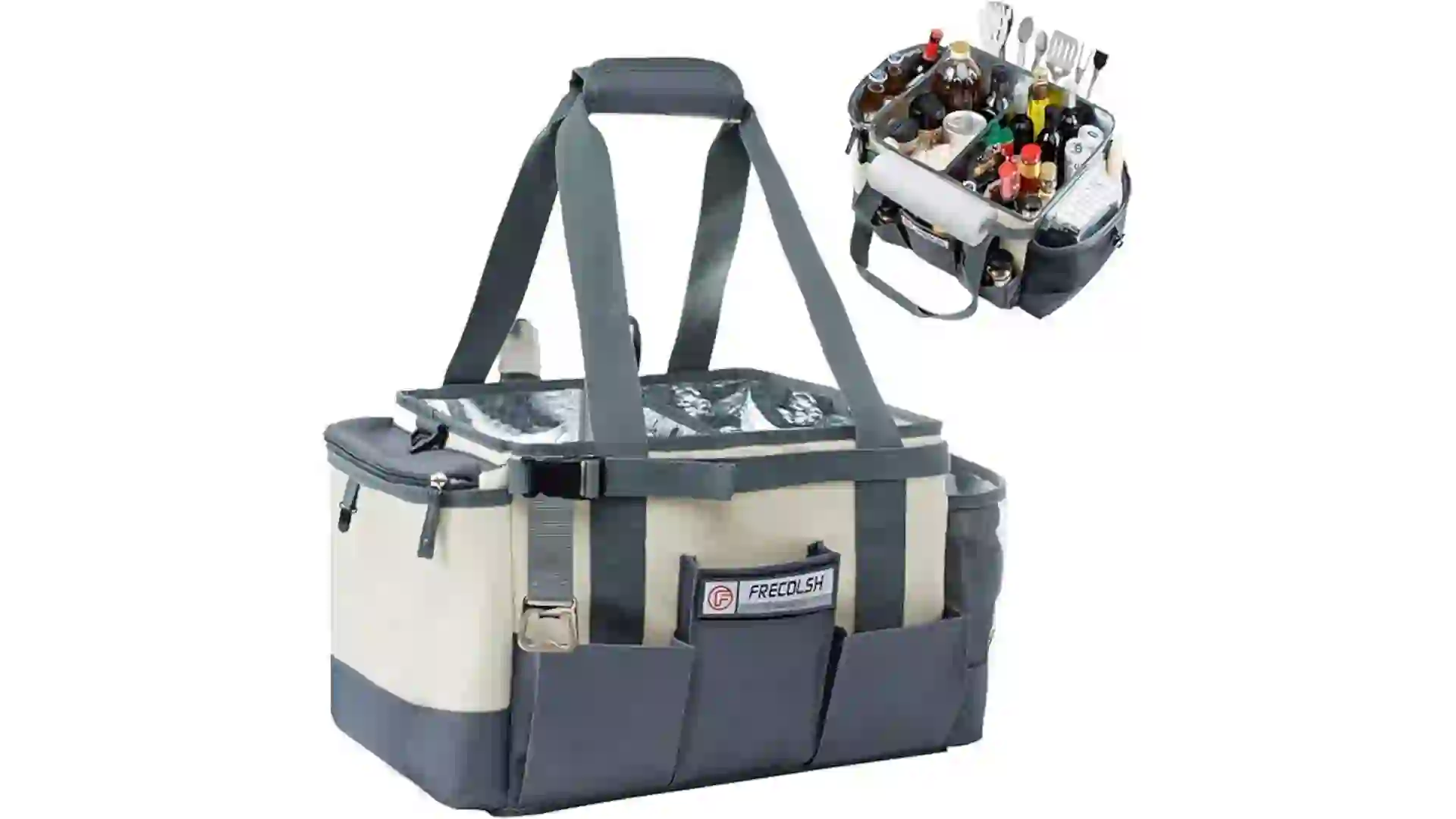 This large grill caddy offers plenty of space for tailgating supplies, like sauces, seasonings and grilling tools, with seven pockets, including two roomy main compartments and two interior mesh side pockets. It also has some unexpected features, like a beer opener on the strap and a built-in paper towel holder. Â