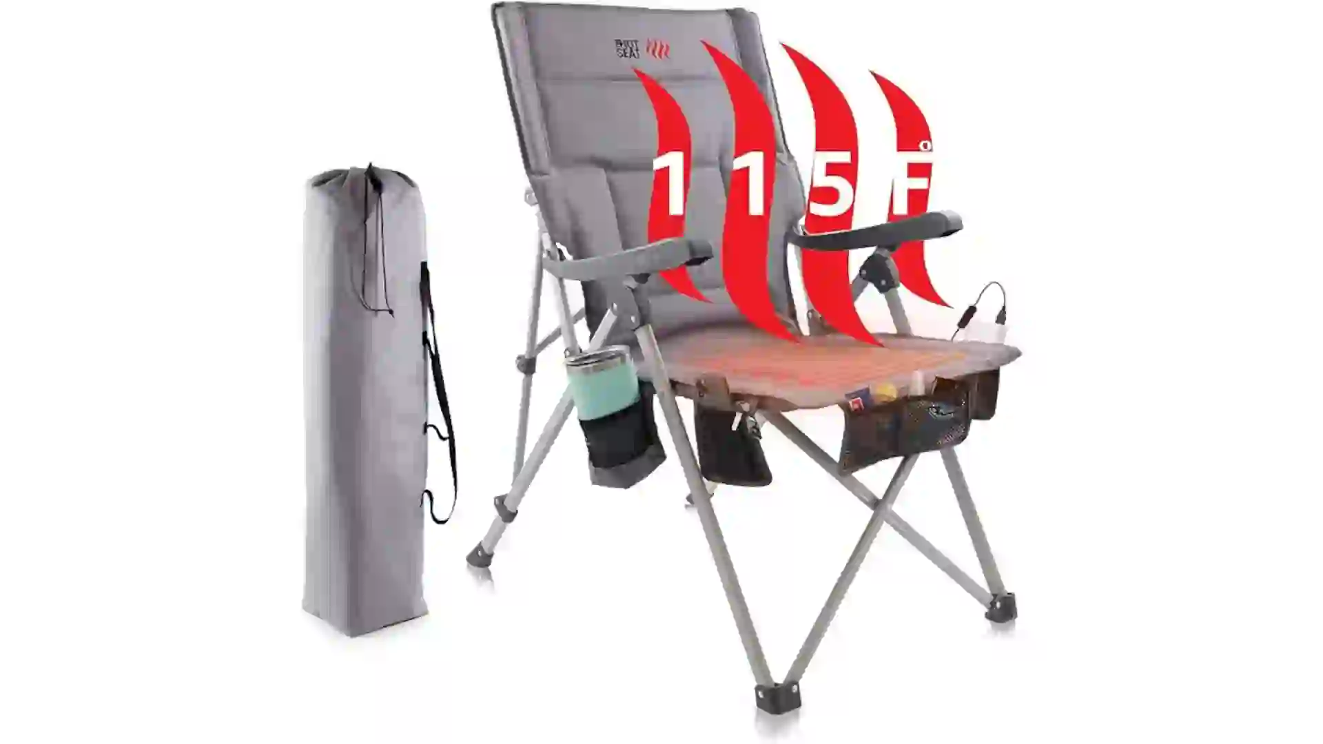 Keep warm during chilly tailgates with this heated camping chair. It works with any USB battery pack (not included) to warm the seat to 115 degrees Fahrenheit. High-density foam padding and extra-wide armrests offer comfortable support, while three reclining positions let you find the right seating angle. The chair also includes a mesh cupholder, phone sleeve and multiple storage pockets to keep necessities handy.Â