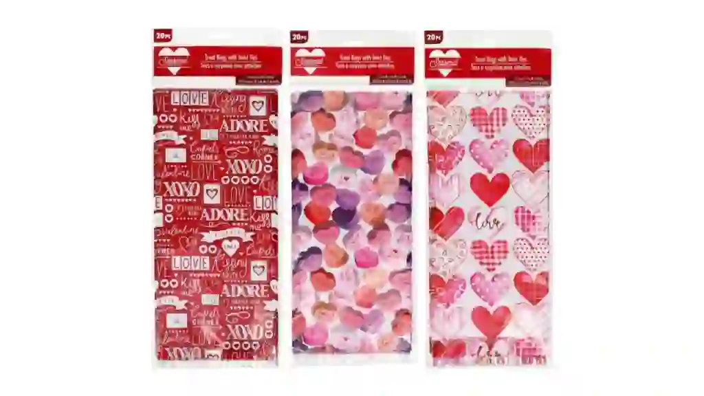 Each set comes with 20 bags in assorted Valentine’s Day-themed prints and enough twist ties to keep bags closed until it’s time to open them.