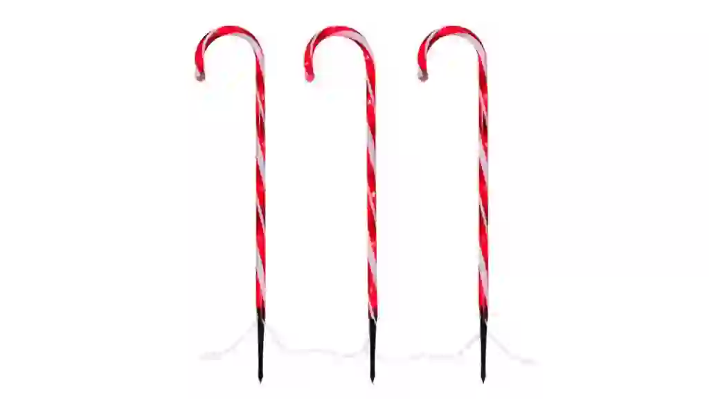 Brighten up the yard, walkway or driveway with LED candy cane yard stakes. Each set comes with three red and white candy cane stakes with built-in LED lights and sturdy stake bases to keep from tipping over.