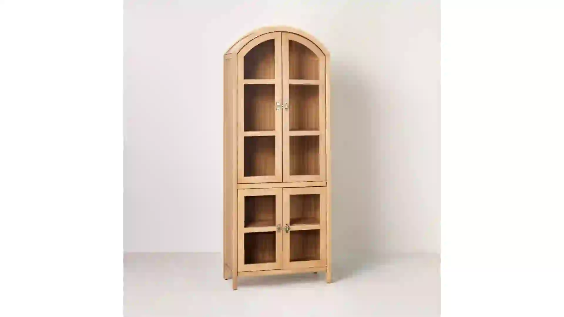 Equipped with five shelves, the grooved wood with glass four-door arch cabinet serves as an ultra-stylish storage space. Rated 4.2 stars, this natural-hued cabinet has a two-tiered design, complete with two windowpane glass doors on each level.