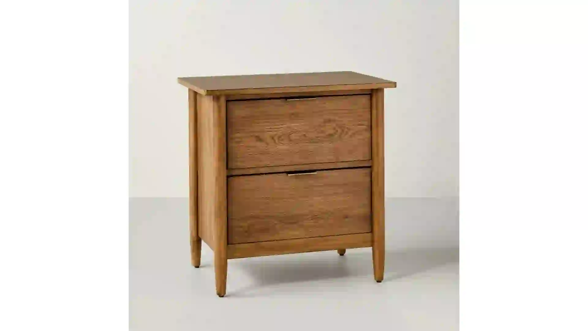 Rated four stars, the rectangular two-drawer modern wood nightstand stands 24 inches high and has a sturdy four-leg support. The aged oak style — the black and natural colors are out of stock — will perfectly blend with your bedroom decor.