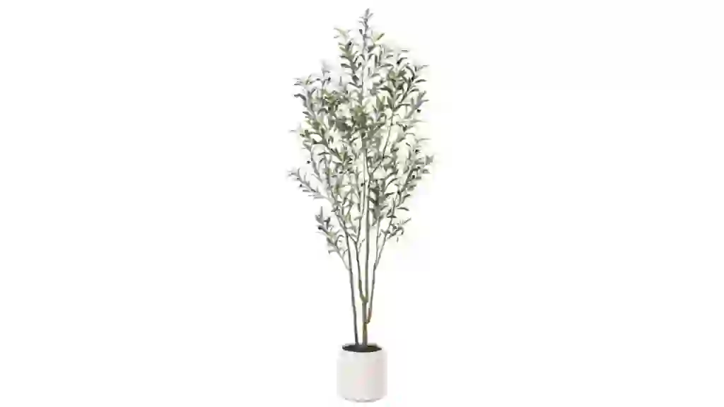 In a foyer, living room or sunroom, this 7-foot potted artificial olive tree from Home Depot will bring a bit of nature into your home, no watering required. Adorn with LED fairy lights for a whimsical touch in any season or leave it as-is for a classic look year-round. The white planter pot matches any décor and provides a stable base for the tree.