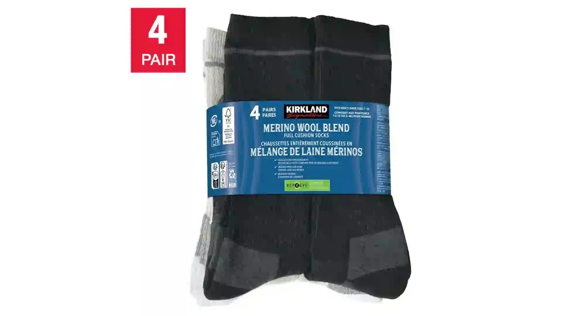 The Kirkland Signature men’s merino wool blend sock offers arch support, with a full cushion and a durable reinforced heel and toe. Each pack contains four pairs of socks — two black and two natural — designed to fit men’s shoe sizes 7 to 13.