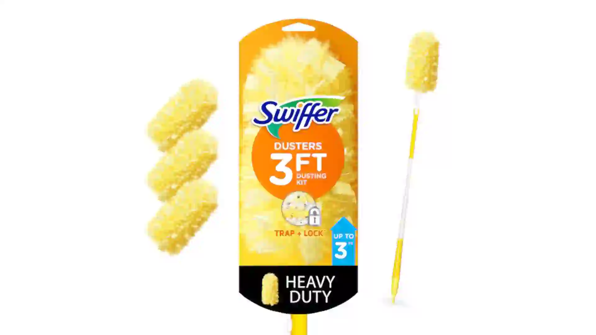 Swiffer heavy-duty dusting kit helps tackle built-up dust on ceiling fan blades and light fixtures without having to drag out a ladder. It includes a handle that extends to 3 feet and three disposable dusters. The heavy-duty version has twice as many fibers as regular Swiffer Dusters, and a 360-degree design that traps particles from every angle. The dusters are also designed to remove up to 95% of common allergens like pet dander and dust mite matter.