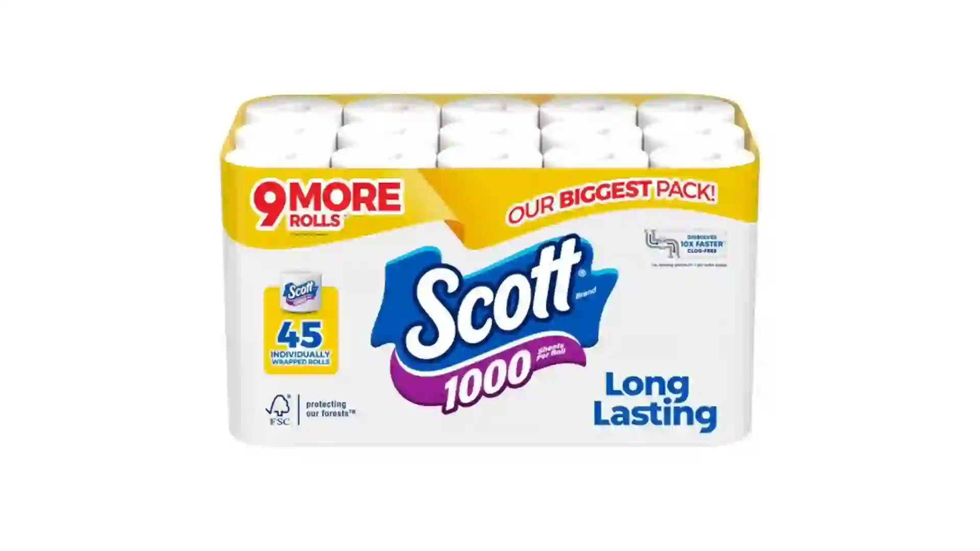 Scott 1000 1-Ply Toilet Paper 45 rolls: $30.48Â