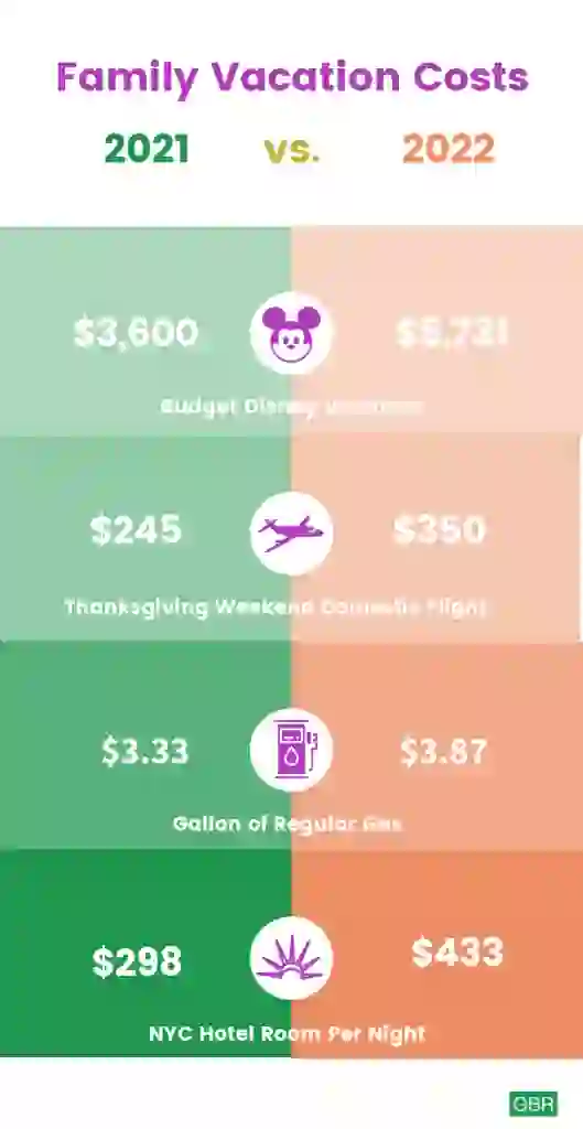 It’s not just you — family vacations have steadily been increasing in price since last year. The latest GOBankingRates infographic breaks down the cost increase on virtually various family vacation expenses from the cost of a trip to Disney parks to holiday flights.