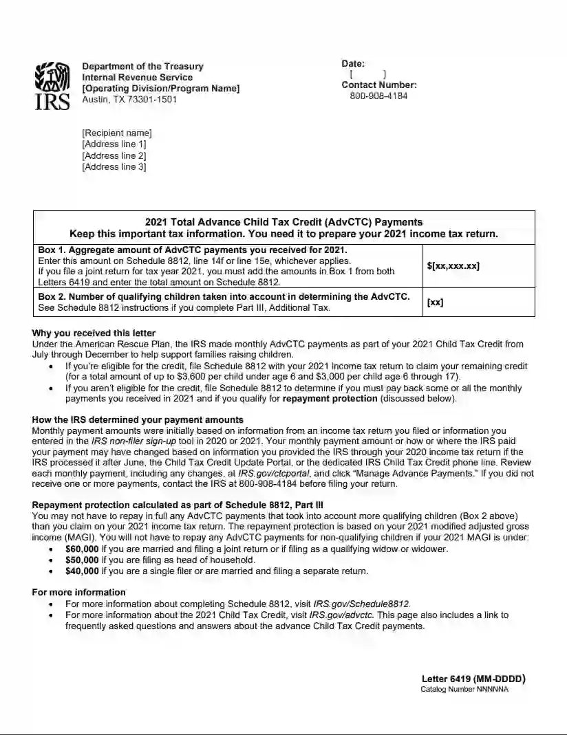 It is imperative that those who received child tax credit funds in 2021 file a tax return — even if they normally do not file — and compare the amount of money they received in the credit with the amount they qualify to claim for 2021. Child tax credit advance payments were paid out to you based on your 2020 and 2019 tax returns, meaning that if your income increased in 2021 and surpassed the income threshold, it’s likely you will need to pay some or all of the credit back once your 2021 income is officially used in your new tax return. You will use Letter 6419 in order to do this, so make sure you do not throw it out.Â