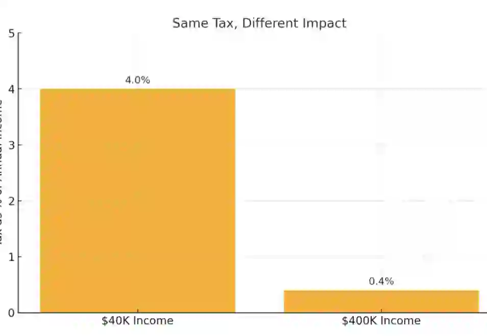 Unlike progressive taxes — where tax rates increase with income — regressive taxes apply the same rate to everyone, regardless of income level.